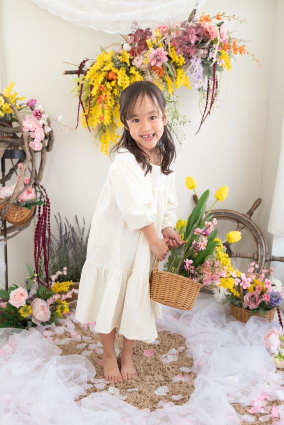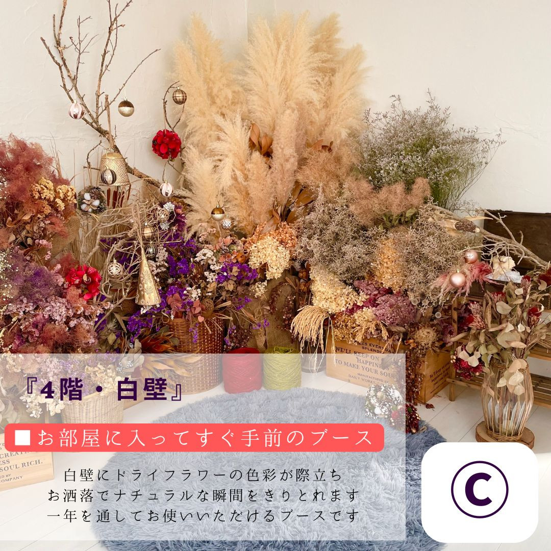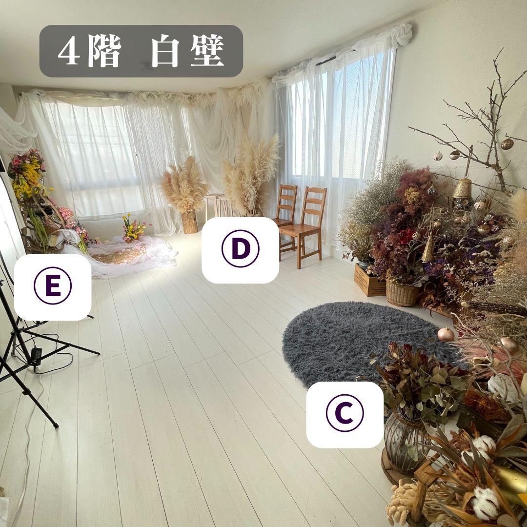 A:最大の特徴は「花が主役の空間」で撮影できることです。普通のセルフフォトスタジオはシンプルな背景が多いですが、re-flowerではドライフラワーを中心に、特別な舞台をご用意しております。