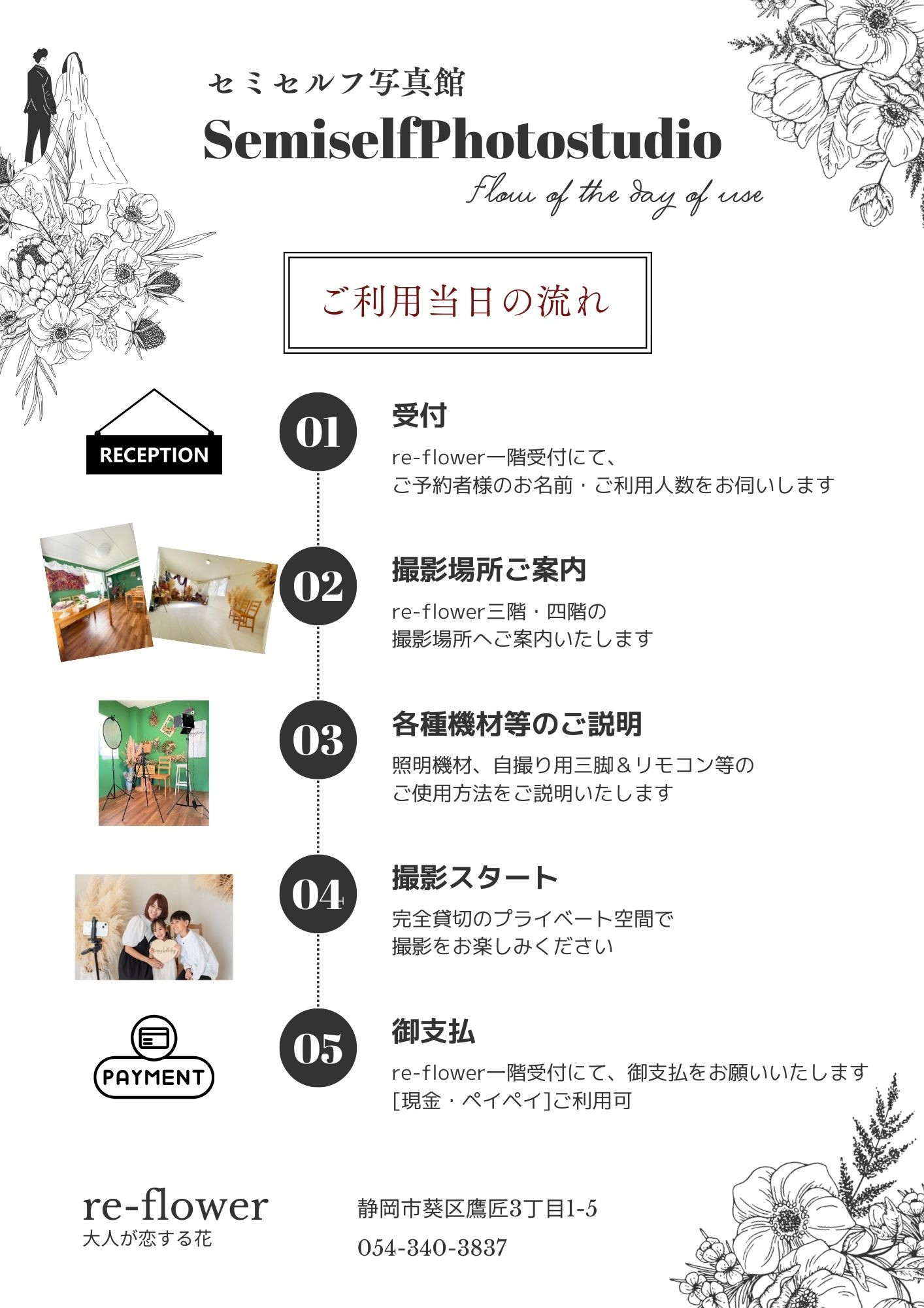 A:静岡で「花に囲まれて撮影できるセルフフォトスタジオ」はre-flowerだけです。ウェディングフォトや記念日撮影で培った花装飾の実績と技術を最大限に活かし、「写真が作品になる体験」を提供しています。
